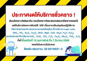 ประกาศงดให้บริการชั่วคราว ! ส่วนวิเคราะห์แร่และหิน กองวิเคราะห์และตรวจสอบทรัพยากรธรณีงดให้บริการวิเคราะห์ด้วยวิธี XRF เนื่องจากปรับปรุงห้องปฏิบัติการ ได้แก่ ตัวอย่างแร่ หิน ดินทราย และธรณีวัสดุอื่นๆ ที่หาปริมาณ major oxide(SiO₂, TiO₂, Al₂O₃, Fe₂O₃, MnO, MgO, CaO, Na₂O, K₂O, P₂O₅)และตัวอย่างแร่ ที่...